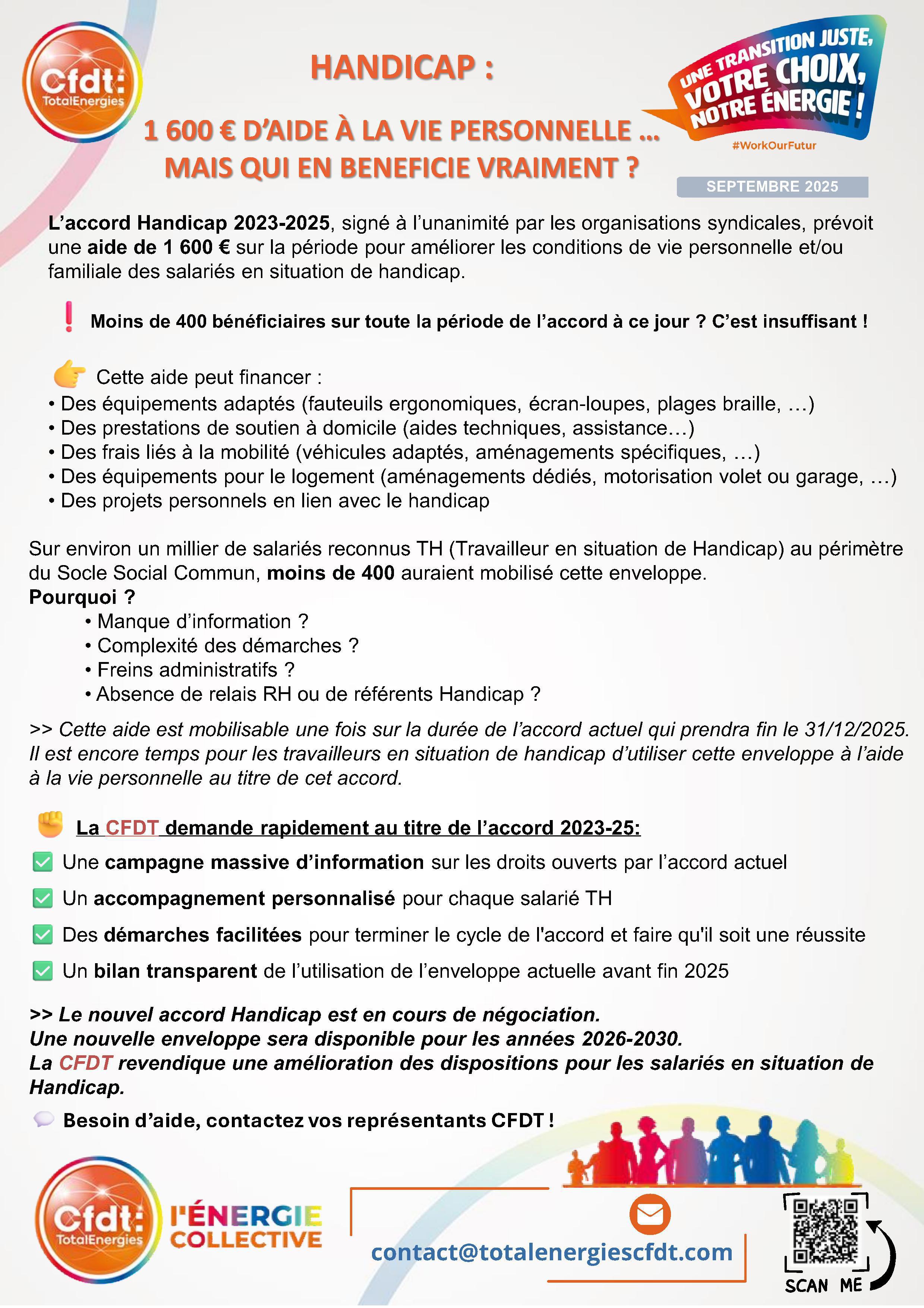 La CFDT demande une campagne massive d'information auprès des salariés en situation de handicap afin de bénéficier de cette aide au titre de l'accord 2023-2025 et d'en faire une réussite d'ici fin décembre 2025.