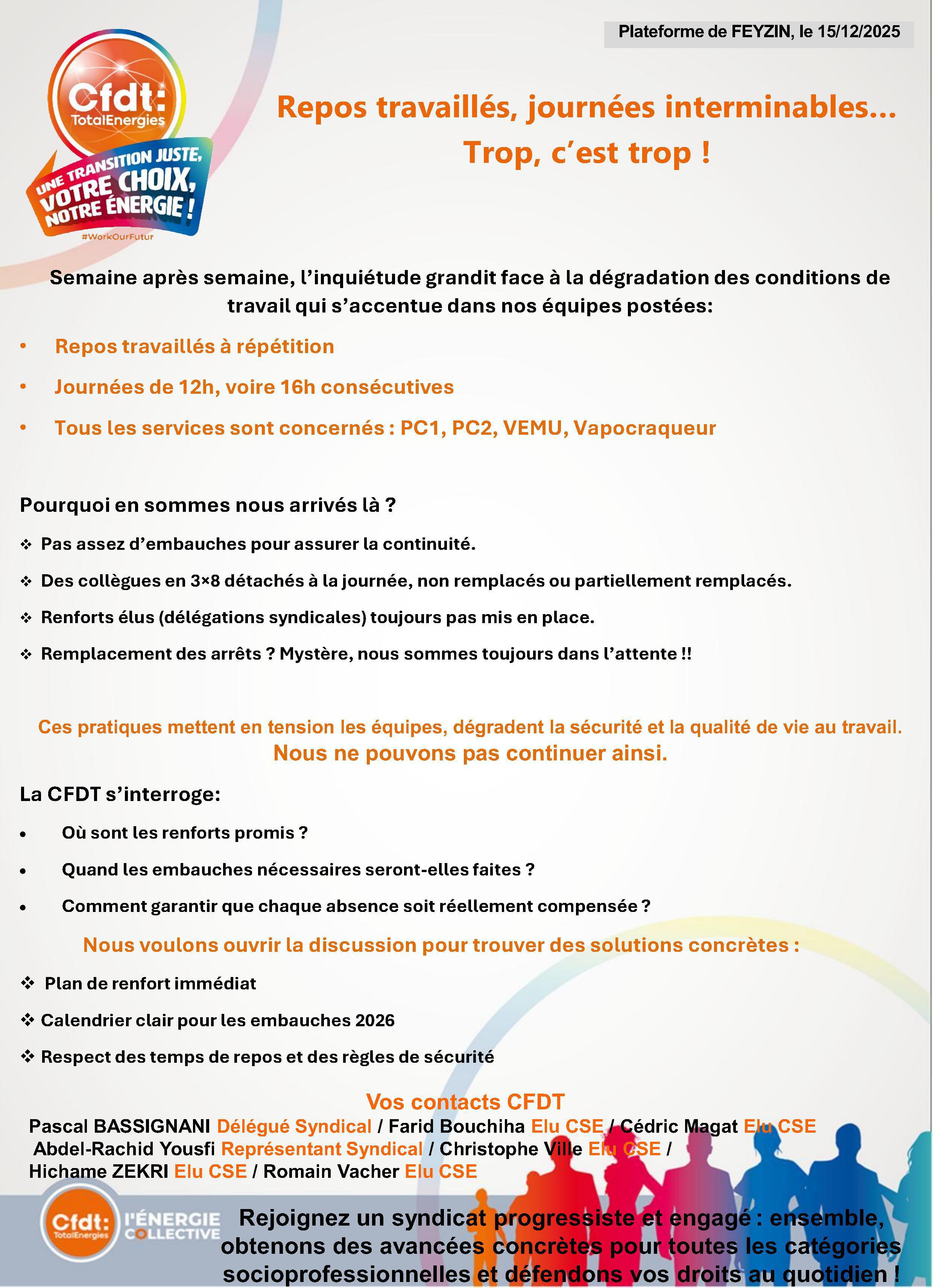 Vous trouverez, ci-dessous, un tract détaillant ces soucis. Nous observons de nombreuses plages horaires de 12h à 16h, des jours de repos travaillés, et il semble que les arrêts maladies ne peuvent pas tout expliquer.