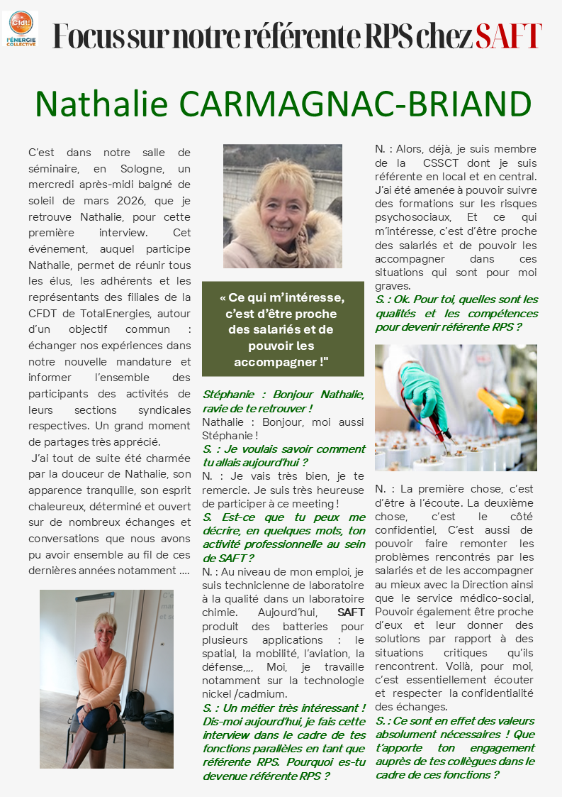 Venez découvrir l'engagement de Nathalie CARMAGNAC-BRIAND en tant que référente RPS chez SAFT.